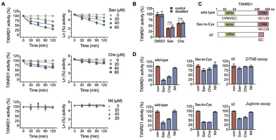 However, the possibility that chelerythrine and sanguinarine also modify the Cys residues of TXNRD1 (Figure 2D) cannot be ruled out. Juglone has been reported as a Sec-independent substrate of TXNRD1, and the reduction of juglone by TXNRD1 is mainly dependent on the FAD/CVNVGC motif [40,41]. The inhibition of chelerythrine and sanguinarine on juglone reduction suggests that the cysteine residue(s) of TXNRD1 can be targeted by chelerythrine or other benzophenanthridine alkaloids (Figure 2D).