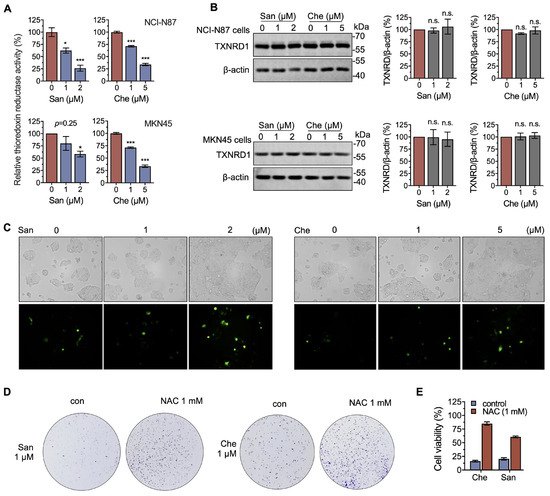 Chelerythrine and sanguinarine induce oxidative stress by inhibiting cellular TXNRD activity. (A) Both chelerythrine (Che) and sanguinarine (San) inhibit the thioredoxin reductase activity of cellular TXNRD1. NCI-N87 cells (upper panel) and MKN45 cells (lower panel) were treated with either chelerythrine or sanguinarine for 4 h, and the cellular TXNRD activity in cell lysates was determined by using an end-point insulin-coupled TXN assay. (B) Expression levels of TXNRD1 following treatment with chelerythrine or sanguinarine. TXNRD1 expression levels were determined after chelerythrine or sanguinarine treatment for 4 h (NCI-N87 cells (upper panel) and MKN45 cells (lower panel)). (C) Chelerythrine and sanguinarine increase cellular ROS levels. NCI-N87 cells were treated with chelerythrine or sanguinarine for 4 h. The level of cellular ROS was quantified by H2DCFH-DA and documented by fluorescence microscopy. (D) The antioxidant NAC rescues the proliferation of NCI-N87 cells from chelerythrine and sanguinarine. A total of 1 mM NAC was co-treated with 1 μM chelerythrine or sanguinarine for 12 h to measure the colony formation. (E) NAC counteracts the cytotoxicity of chelerythrine and sanguinarine. Cells were treated with 2 μM sanguinarine and 5 μM chelerythrine, with or without 1 mM NAC, for 24 h. n.s. means not significant, *, p < 0.05, ***, p < 0.001.