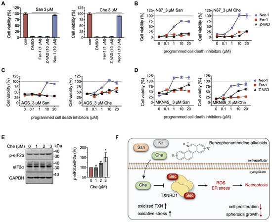 Chelerythrine and sanguinarine elicit necroptosis in NCI-N87 cells by inducing ER stress. (A) RIPK1 inhibitor Nec-1 suppresses cell death induced by chelerythrine (Che) or sanguinarine (San) in NCI-N87 cells. A total of 1 μM Fer-1, 10 μM Z-VAD, and 10 μM Nec-1 were used in this experiment. (B–D) Chelerythrine induces necroptosis in gastric cancer cells. Programed cell death inhibitors ranging from 0 to 20 μM were separately added to the cultured cells that were incubated with 3 μM of either chelerythrine or sanguinarine. After cell cultivation for 24 h, cell viability was determined using MTT assay. (E) Chelerythrine-induced ER stress in NCI-N87 cells. NCI-N87 cells were treated with the indicated concentrations of chelerythrine for 36 h, and the samples were analyzed using Western blots. (F) Schematic diagram of benzophenanthridine alkaloids like chelerythrine inducing necroptosis in gastric cancer cells. Herein, cellular consequences of chelerythrine may include up-regulation of oxidized TXN, increased oxidative stress, and suppression of cell proliferation, in particular hindering the spheroids’ growth. *, p < 0.05.