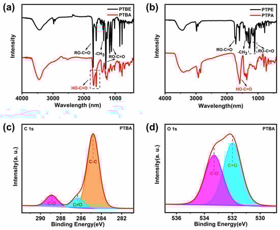 (a) FTIR spectra of PTBE and PTBA; (b) FTIR spectra of PTPE and PTPA; XPS spectra of PTBA (c) C 1s and (d) O 1s.