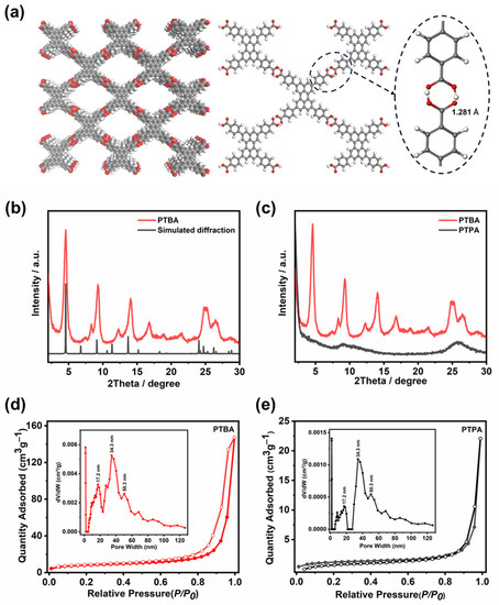 (a) The eclipsed structure model of PTBA and a view of the HOF structure and the schematic representation of intermolecular hydrogen bond in PTBA, C (grey), H (white), O (red); (b) experimental and simulated XRD patterns of PTBA; (c) XRD patterns of PTBA and PTPA; nitrogen adsorption–desorption curve and pore-size distribution (inset) of (d) PTBA and (e) PTPA, hollow circles: adsorption, filled circles: desorption.