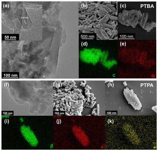 (a) TEM, (b) SEM images at different view angles, (c–e) EDS mapping images of PTBA; (f) TEM, (g) SEM images at different view angles, (h–k) EDS mapping images of PTPA.