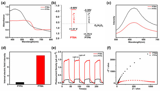 (a) UV-vis DRS spectra, (b) band diagram, (c) PL spectra, (d) normalized internal electric field, (e) transient photocurrent curves, and (f) EIS Nyquist plots of PTBA and PTPA.