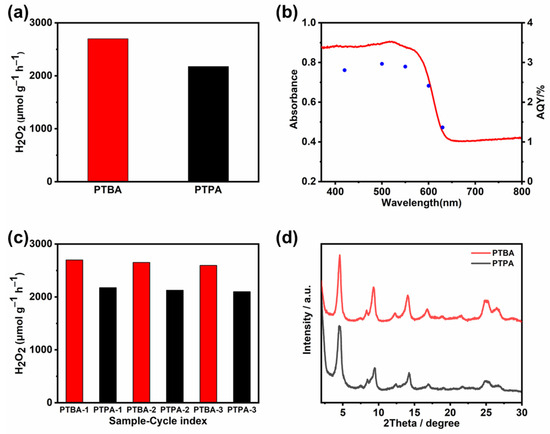 The photocatalytic activities of PTBA and PTPA toward H2O2 generation were determined under visible light irradiation with benzyl alcohol as the sacrificial reagent. No continuous O2 bubbling was adopted. As illustrated in Figure 5a, PTBA exhibits an excellent H2O2 yield of 2699 μmol g−1 h−1 under ambient test conditions, which is higher than PTPA (2176 μmol g−1 h−1). The enhanced photocatalytic activity of PTBA can be attributed to its high crystallinity. High crystallinity represents a directional arrangement of molecules, suppressing thermal vibration and reducing the possibility of exciton recombination, which leads to the promotion of separation and transfer of photocarriers [29,35]. Furthermore, the suitable electronic band structure allows for excellent reduction capacity, which is more favorable to photocatalytic from oxygen to H2O2. To understand the spectral distribution of the photocatalytic ability of PTBA, the apparent quantum yield (AQY) values were collected as a function of the wavelength of the incident light (Figure 5b). The AQY at a given wavelength was calculated from the following equation [36]: