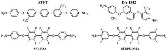 - Wozniak, A.I.; Yegorov, A.S.; Ivanov, V.S.; Igumnov, S.M.; Tcarkova, K.V. Recent Progress in Synthesis of Fluorine Containing Monomers for Polyimides. J. Fluorine Chem. 2015, 180, 45–54. [Google Scholar] [CrossRef]