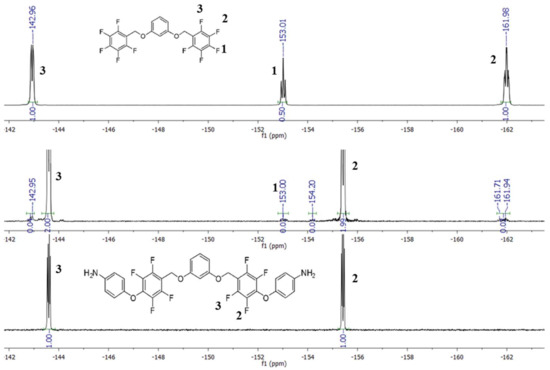 3.3. Preparation of 4,4′-[1,3-bis[(2,3,5,6-tetrafluorobenzyl)oxy]benzene]bis(oxy)aniline (PFM–Diamine, Monomer 1)