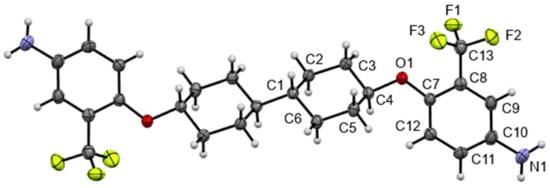 2.3. Further Characterization of the PFM–Diamine Monomer (Monomer 1), the Bicyclohexyl–Dinitro Compound, and the Bicyclohexyl–Diamine Monomer (Monomer 2), including the Crystal Structure of the Bicyclohexyl–Diamine Monomer (Monomer 2)