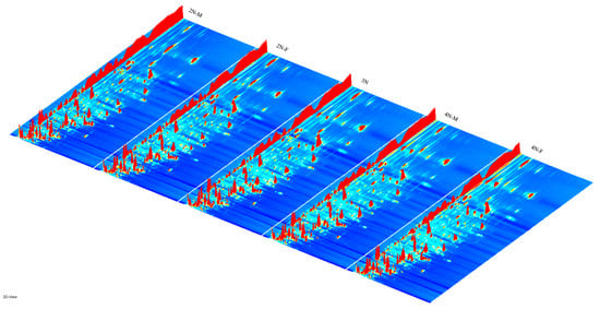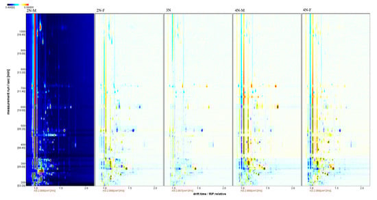 The three-dimensional spectra of volatile matter information of oysters with different ploidy are shown in Figure 1. In the figure, the x-axis represents the ion migration time; the y-axis represents the retention time of gas chromatographic; and the z-axis represents the peak intensity [22]. The three-dimensional spectrogram could intuitively represent the differences in VOCs in different samples. From the spectrogram, there were certain similarities in volatile compounds between samples, but the graph does not accurately identify samples that have greater contents of volatile compounds. Two-dimensional spectra of different oyster samples are shown in Figure 1. The results showed that the peak signal distribution of volatile compounds among oysters of different ploidy was similar, but the peak signal intensity in each sample was different, indicating variation in the content of volatile compounds. The two-dimensional spectrum of volatile components in the samples is shown in Figure 2. In the figure, the top view shows the three-dimensional spectrum, and the types and concentrations of volatile components in different samples can be noted. The red vertical line at abscissa 1.0 represents the RIP peak (reaction ion peak, normalized), and the bright spots on both sides represent volatile substances. Each point represents a substance. White indicates a low content of a substance, and red indicates a high concentration of the substance. As shown in Figure 2, the migration time of each substance was generally in the range of 1.0–2.0 s, and the chromatographic retention time was in the range of 200–1000 s. A comparison chart of differences is shown in Figure 3. The chart visually shows the differences in substance contents. Compared with other groups using diploid males (2N-M) as the reference group, if the composition was consistent, this is indicated by a white background, red indicates a higher substance content than the reference group, and blue indicates a lower substance content than the reference group. As shown in Figure 3, the volatile substances of C. gigas varied with ploidy.