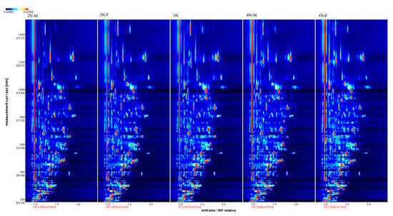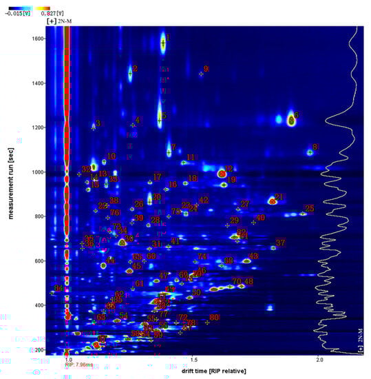 Figure 4 shows the qualitative analysis results of the database search. The number next to the signal peak in the figure represents a specific flavor compound. Using the NIST (National Insititute of Standards and Technology and IMS migration time database with 2N-M as an example, a total of 85 signal peaks and 54 volatile compounds were detected (Table 1). Due to the limited data in the database, some compounds were not identified [23]. Among the identified compounds, there were 21 aldehydes, 12 ketones, eight alcohols, five esters, three furans, two acids, two pyrazines, and one ether. Since high concentrations of monomer ions and neutral molecules may form dimers in the drift region, a single compound may produce multiple signals, i.e., a monomer (M) and dimer (D) of the same compound. These included phenylacetaldehyde, propanoic acid, (E)-non-3-en-2-one, (E)-2-nonenal, benzaldehyde, furfural, 3-(methylsulfanyl) propanal, (E)-2-octenal, (E,E)-2,4-hexadienal, 1-nonanal, 1-hexanol, 2-butanone, 3-hydroxy, 3-octanone, (Z)-4-heptenal, and 1-pentanol. The volatile components detected are listed in Table 1.