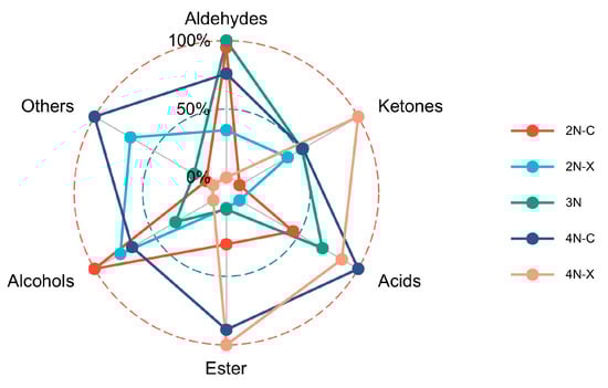 Aldehydes, ketones, alcohols, and esters were the main components of VOCs in the oyster samples. As shown in Figure 5, the tetraploid oysters show an increase in volatile components compared to diploid and triploid oysters, which suggests that the flavors of oysters differ between ploidy. The content of esters was higher in diploid females than in diploid males, and the content of ketones was higher in diploid males than in diploid females. There were also visual differences between the gender of the tetraploid oysters, which suggests a difference in flavor between the gender.