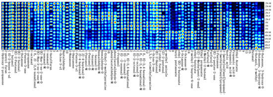 To more intuitively distinguish the patterns in VOCs in different oysters under high-temperature conditions, the Callery plot plugin for the laboratory analytical viewer (LAV) software was used to generate the fingerprints, as shown in Figure 6. Each horizontal row represents all of the volatile flavor substances in each sample, and each vertical column represents the content of the same VOCs in different samples. The colors of the dots represent the contents of the compounds. The redder the color, the higher the content.