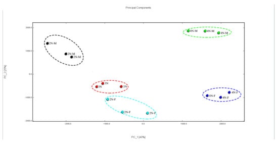 Principal component analysis (PCA) is an important dimensionality reduction classification method [38]. This method has been widely used in the study of chemical fingerprints. The PCA analysis is shown in Figure 7. The total contributions of PC1 and PC2 were 40% and 25%, respectively. After dimensionality reduction, the cumulative contribution of the first two principal components was more than 65%. After feature compression, more information was retained that could characterize the feature differences of the original data. In terms of the degree of aggregation and dispersion of samples, the tetraploid samples were well separated and had apparent differences in characteristics. The difference in characteristics between diploids and triploids was not significant, especially between 3N and 2N-F.