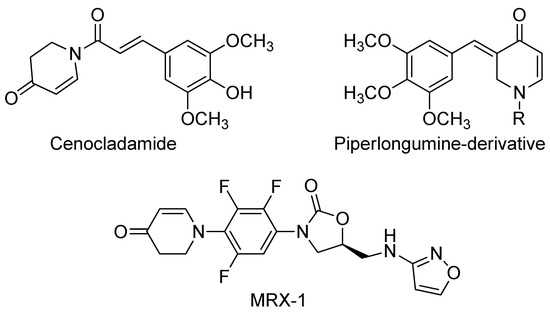 2,3-Dihydropyridin-4(1H)-one is a partial structure of cenocladamide, an alkaloid from Piper cenocladum [24]. This alkaloid and derivatives thereof have previously been investigated for their anticancer potency [25]. Furthermore, the dihydropyridin-4(1H)-one moiety is part of derivatives of piperlongumine, which have been investigated for their anticancer activity [26] as well as of the potent antibacterial MRX-I [27] (Figure 1). Therefore, we investigated the new compounds for their anticancer activities as well as their antibacterial potency in vitro.