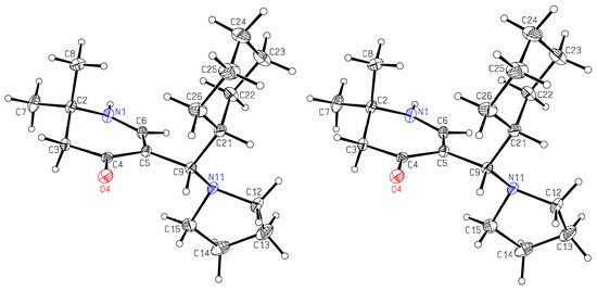 Finally, evidence of the structure of compound 6a was achieved using a single X-ray crystal analysis which confirmed the compound as 5-[cyclohexyl(pyrrolidin-1-yl)methyl]-2,2-dimethyl-2,3-dihydropyridin-4(1H)-one. This is the first determination of a structure containing a (pyrrolidin-1-yl) substituent in a 2,3-dihydropyridin-4(1H)-one (Figure 3). All atoms lie on general positions. The compound is a racemate.