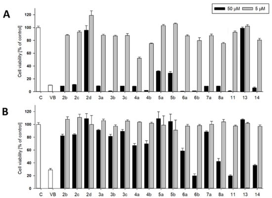 Anti-proliferative activity of compounds 2b–14 against human leukemia cell line CCRF-CEM (A) and against non-tumorigenic MRC-5 lung fibroblasts (B) expressed as mean ± SEM. Cells were treated with 50 and 5 µM of the compounds for 72 h. Cell viability was measured via XTT assay. Viability rates were expressed as a percentage of vehicle-treated control cells (0.1% DMSO). Vinblastine (VB) at a concentration of 100 nM served as positive control.