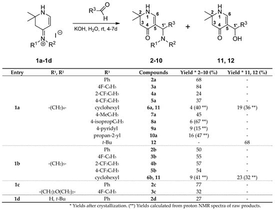The different 4-dialkylaminotetrahydropyridinylidene salts 1a–1d used as starting products were prepared as described earlier [1]. They were exposed for several days to aromatic aldehydes or aliphatic aldehydes in an alkaline medium at room temperature. Hydrolysis of 1a–1d in ring position 4 was taken into account, but the expected β-hydroxyketones 11 and 12 were only formed as the main product from the aliphatic cyclohexane carbaldehyde and pivalaldehyde, whereas the β-aminoketones 6a and 6b were isolated as by-products. The reaction of salts 1a–1d with aromatic aldehydes afforded mainly β-aminoketones (compounds 2–5 and 7–10) (Scheme 2).