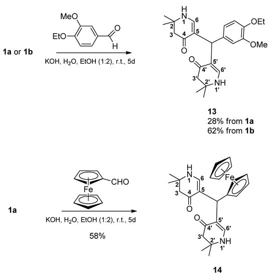 Due to the low solubility in water of solid ferrocenyl carbaldehyde and 4-ethoxy-3-methoxybenzaldehyde, ethanol was added to the reaction mixture. Other than the so far reported reactions, these electron-sufficient aldehydes resulted in dimers 13 and 14 (Scheme 3).
