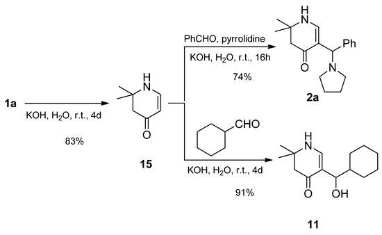 In order to confirm the initial steps of the proposed mechanism, we treated the 4-dialkylaminotetrahydropyridinylidene salt 1a with potassium hydroxide for 4 days to yield dihydropyridone 15, quantitatively. Then, a mixture of pyrrolidine and benzaldehyde in alkaline solution was added and considerable amounts of 2a were formed overnight. The reaction of 15 without secondary amine resulted in a high yield of the hydroxy analog 11 (Scheme 4).
