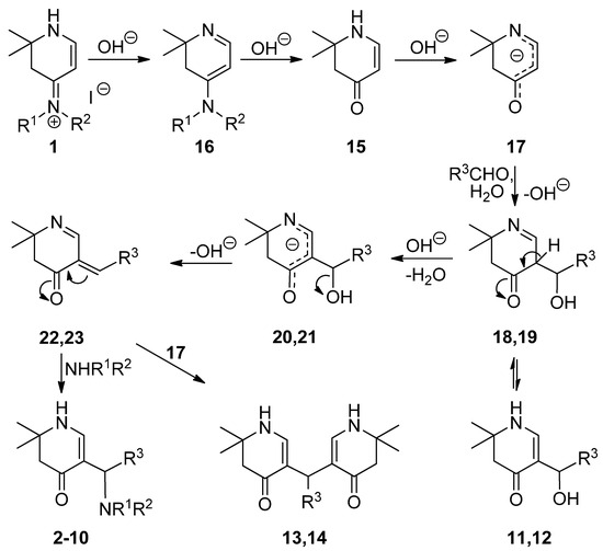 The reaction mechanism can be considered as follows: The 4-dialkylaminotetrahydropyridinylidene salts 1 are deprotonated by potassium hydroxide to their corresponding bases 16 in the first step. Due to strong alkaline conditions, these are hydrolyzed to ketone 15 which is deprotonated to the resonance-stabilized anion 17. The formed methylene component is readily attacked by aldehydes resulting in aldols 18,19. If R3 is an aliphatic group, tautomerization to compounds 11,12 may occur. Moreover, a proton can be abstracted from the α-position of aldols 18,19. Cleavage of a hydroxy group from the formed resonance-stabilized anions 20,21 leads to α,β-unsaturated ketones 22,23. Addition of secondary amines in β-position yields β-aminoketones 2–10. This is the main reaction for the less electrophilic aromatic aldehydes as well as isobutyric aldehydes. Alternatively, compounds 22,23 can be attacked by anion 17 resulting in δ-diketones 13, 14 via a Michael reaction (Scheme 5).