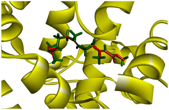 Prior to docking the alkaloids examined in this study, the docking method underwent validation through re-docking. The cocrystallised JH3 ligand was repositioned into the mJHBP protein binding site. The re-docking of JH3 into the mJHBP receptor yielded an RMSD value of 0.26 Å between the pose achieved in the docking and the experimental pose. This result suggests that the GOLD program’s fitting procedure exhibits satisfactory accuracy in repositioning JH3 within the active site of mJHBP. This is because, as stated by Wang et al. [], a prediction is deemed successful when the RMSD between the embedded binding pose and the crystallographic ligand’s pose is 2.0 Å or less (Figure 1). Figure 1 illustrates the superimposed alignment of the re-docked pose and the crystallographic ligand.