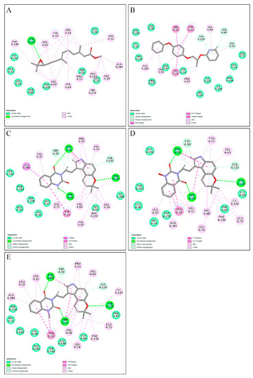 The selected compounds were also observed to have hydrophobic interactions with the residues Tyr33, Leu37, Val51, Trp53, Pro55, Val65, Val68, Leu74, Tyr133, Ile140, Phe144, and Ala281, thereby limiting the active site of mJHBP. These findings are consistent with other molecular docking studies targeting the mJHBP enzyme [,,,].