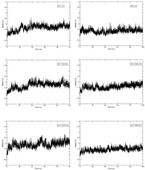 Each system was then gradually heated to 300 K during 200 ps; next, 300 ps of density equilibration, with positional restrictions on the protein–ligand atoms, was performed at a constant volume. All protein–ligand complexes were equilibrated with 500 ps of MD without positional restrictions at a steady pressure prior to the production process. By using a collision frequency of 2 cm−1 and linking to a Langevin thermostat, the temperature was kept at 300 K. The SHAKE [] algorithm and the particle mesh Ewald (PME) [,] approach were used to limit the bond lengths involving the hydrogen atoms, and a cutoff of 8 was applied for non-bonded interactions. Finally, without applying positional restrictions, 100 ns of time at a 300 K temperature was used for the MD simulations (production). The root-mean-square deviation (RMSD), root-mean-square fluctuation (RMSF), radius of gyration (Rg), and hydrogen bonds were calculated to monitor the stability of the MD simulations.