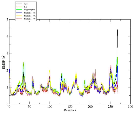 RMSF graph of the Apo protein mJHBP, and mJHBP complexed with JH3 ligands, pyriproxyfen, NuBBE_1105, NuBBE_1106, and NuBBE_1107.