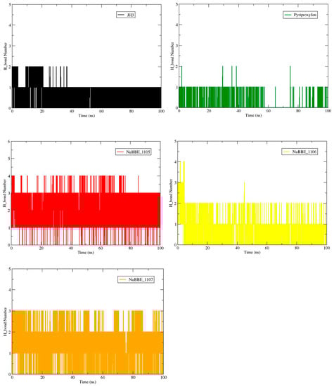 Protein–ligand interactions are generally stabilized by various types of interactions, with hydrogen bonds being one of the most significant []. This study investigated the hydrogen bonds between the mJHBP protein and five ligands over a 100 ns MD simulation. The results are presented in Figure 6 and Table 2.