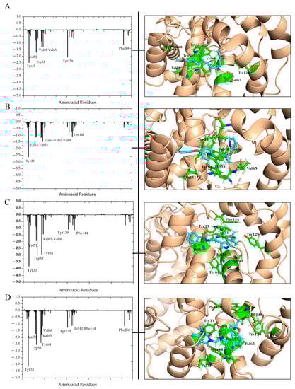 The mJHBP–NuBBE_1107 complex (Figure 7D) is primarily stabilized by the residues Tyr33, Val51, Tpr53, Tyr64, Val65, Val68, Tyr129, Ile140, and Phe144. These residues contribute significantly to the total energy, with respective energy values of −4.13, −1.71, −2.54, −2.40, −1.77, −1.17, −1.30, −1.09, and −1.10 kcal·mol−1. In the mJHBP–NuBBE_1105 complex (Figure 7C), the residues Tyr33, Val51, Tpr53, Tyr64, Val65, Val68, Tyr129, and Phe144 contributed significantly to the complex’s stability, exhibiting energy values of −3.82, −1.95, −3.08, −2.94, −1.48, −1.44, −1.10, and −1.05 kcal·mol−1, respectively. These findings indicate that the enzyme–NuBBE_1107 complex provides more favorable contributions to the binding free energy than the NuBBE_1105 complex. Residues with relatively large differences in their contributions to the total binding free energies warrant further attention. In the NuBBE_1107 system, the residues Tyr33, Trp53, Tyr64, and Tyr129 are particularly noteworthy, while in the NuBBE_1105 system, residues Tyr33, Trp53, and Tyr64 are most significant.