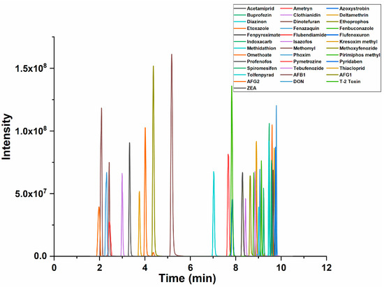 To achieve the best peak shape, higher sensitivity and shorter analysis time, an optimization of the chromatographic conditions was carried out. Methanol and acetonitrile were tested as organic phases, both showing good peak shapes. Acetonitrile was selected due to the shorter analysis time. Formic acid, acetic acid and ammonium acetate (5.0, 10.0 and 15.0 mM, respectively) were evaluated as mobile-phase modifiers. It was found that 0.1% of formic acid provided the same sensitivity and resolution as 5 mM of ammonium acetate for mycotoxins (AFB1 was taken as an example; the MRM chromatograms under different mobile-phase conditions are shown in Figure S1A). For pesticides, the highest peak intensity was observed under 5 mM of ammonium acetate for most pesticides (fenazaquin was taken as an example; the MRM chromatograms under different mobile-phase conditions are shown in Figure S1B). A few pesticide residues, such as pirimiphos methyl and tolfenpyrad, indicated that 10 mM of ammonium acetate might be optimal, but the intensities were not significantly increased compared to 5 mM. Moreover, the effect of 10 mM of ammonium acetate on the chromatographic performance was found to be deleterious, greatly increasing the back pressure on the column [25]. Consequently, 5 mM of ammonium acetate was chosen as the mobile phase. The typical UPLC-MS/MS total ion current (TIC) chromatogram of 31 pesticide residues and six mycotoxins under optimized conditions is shown in Figure 1. The retention times of each compound are listed in Table 1, and the MRM chromatograms of each compound are shown in Figure S3.