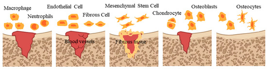 Bone regeneration relies on an ideal microenvironment. The microenvironment of bone regeneration is very complex. On the one hand, it is the cross action of various cells, including mesenchymal stem cells, immune cells, endothelial cells, osteoblasts and osteoclast, as well as a variety of bioactive factors, which are involved in osteogenesis, angiogenesis and inflammatory regulation [36]. On the other hand, it spans various stages of bone healing (Figure 1), including hematoma, inflammation, fibrous callus formation, intramembrane ossification, endochondral ossification and bone remodeling accompanied by an orderly cascade of anabolism and catabolism [37].
