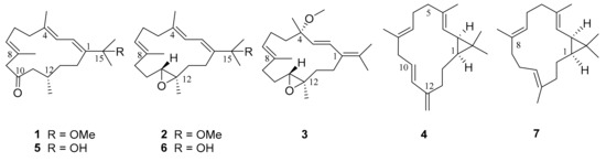 The acetone extract of S. nanolobata was portioned between Et2O and H2O to afford the Et2O-soluble fraction, which was subjected to silica gel column chromatography to yield 12 subfractions. The subfractions were further purified using repeated silica gel, Sephadex LH-20, and reversed-phase HPLC to afford compounds 1–7. The known compounds were rapidly characterized as grandilobatin D (5) [6], 11,12-epoxy-1E,3E,7E-cembratrien-15-ol (6) [15], and casbene (7) [16] by comparing the observed and reported spectroscopic data.
