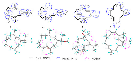 The 1H–1H COSY, key HMBC, and NOESY correlations of compounds 1–4.