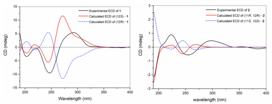 The TDDFT-ECD calculation was carried out to deduce the absolute configuration of 1, which has been proven to be a reliable structure elucidation method for the determination of the absolute configuration of natural products. In detail, torsional sampling conformational searches using MMFFs (Merck Molecular Force Field) were carried out by means of the conformational search module in the Macromodel by applying an energy window of 21 kJ/mol, which afforded 145 conformers for (12S)-1. The Boltzmann populations of the conformers were obtained based on the potential energy provided by the MMFFs, which afforded five conformers for re-optimization. The re-optimization and the following TDDFT calculations of the re-optimized geometries were all performed using Gaussian 09 at the B3LYP/6-311G(d,p) level with IEFPCM (Polarizable Continuum Model using the Integral Equation Formalism variant) solvent model for acetonitrile. Frequency analysis was performed as well to confirm that the re-optimized geometries were at the energy minima. Finally, the SpecDis 1.62 software was used to obtain the Boltzmann-averaged ECD spectra and visualize the results. Detailed comparison of the experimental ECD spectrum with those of calculated ones revealed that the Boltzmann-averaged ECD spectrum of (12S)-1 displayed an identical curve compared to the experimental one (Figure 3). Consequently, the absolute configuration of 1 was determined as 12S.