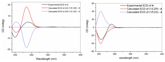 Experimental and calculated ECD spectra of 3 and 4.