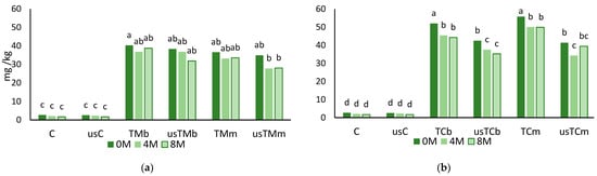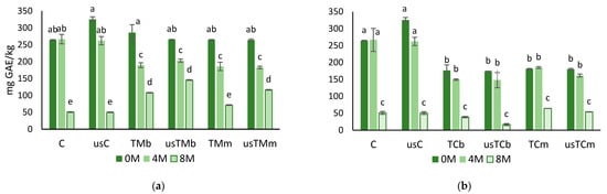 Total phenols after storage (0M—without storage; 4M and8M—after 4 and 8 months of storage) for the virgin olive oil (control) and the oils obtained in the trials with mastic thyme (a) and lemon thyme (b), either submitted to US treatment or not (C—control; us—trials with USAE; TM—Thymus mastichina; TC—Thyme citriodorus; b—beating; m—mill) (for each storage period and each thyme, different letters mean differences between trials at p < 0.005; Sheffé test).