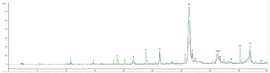 Phenolic profile of Cornicabra olive oils (C—blue), T. mastichina flavored olive oil preparations (TMb—green; TMm—orange) at 280 nm (1—hydroxytyrosol; 2—tyrosol; 3—vanilic acid; 4—caffeic acid; 5—vanillin; 6—p-coumaric acid; 7—unidentified; 8—unidentified; 9—o-coumaric acid; 10—3,4-DHPEA-EDA; 11—oleuropein; 12—rosmarinic acid; 13 + 14—oleocanthal + pinoresinol; 15—cinnamic acid; 16—luteolin; 17—unidentified; 18—unidentified; 19—apigenin).