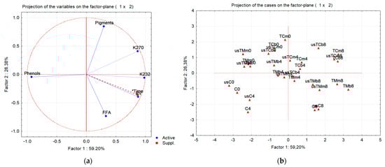 PCA of all oil samples characterized by chemical quality parameters, phenolic and chlorophyll pigment contents after storage (0—without storage; 4 and 8—after 4 and 8 months of storage) for virgin olive oil (samples C) and oils obtained in the trials with mastic thyme (TM) and lemon thyme (TC), either submitted to US treatment or not (us—trials with USAE; b—beating; m—mill). (a) Plot of the variable loadings on the plane defined by Factor 1 and Factor 2 (*Time- storage time was added as illustrative/supplementary variable); (b) Plot of the oil samples on the plane defined by Factor 1 and Factor 2.