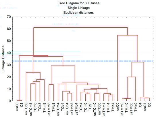 Dendrogram of all oil samples characterized by chemical quality parameters, phenolic and chlorophyll pigment contents after storage (0—without storage; 4 and 8—after 4 and 8 months of storage) for virgin olive oil (samples C) and oils obtained in the trials with mastic thyme (TM) and lemon thyme (TC), either submitted to US treatment or not (us—trials with USAE; b—beating; m—mill).