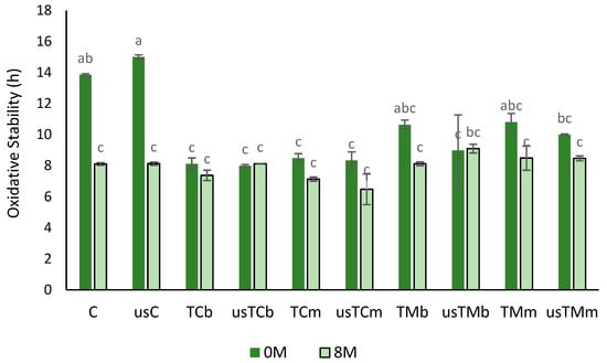 Oxidative stability (hour) after storage (0M—without storage; 8M—after 8 months of storage) for VOO (control) and oils obtained in the trials with mastic thyme and lemon thyme, either submitted to US treatment or not (C—control; us—trials with USAE; TM—Thymus mastichina; TC—Thymus citriodorus; b—beating; m—mill) (different letters mean differences between trials at p < 0.005; Sheffé test).