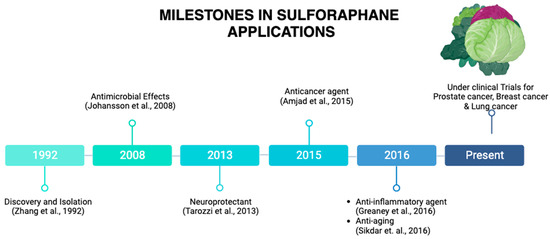 Milestones in SFN applications. SFN was discovered in 1992. A remarkable milestone has been reached, from its applications as an antimicrobial agent, a neuroprotective agent, an anticancer agent, and anti-inflammatory agent to currently being under clinical trials for prostate cancer, breast cancer, and lung cancer, among others. This illustration was made with Biorender.com (accessed on 8 August 2023) [2,8,9,10,11,12].
