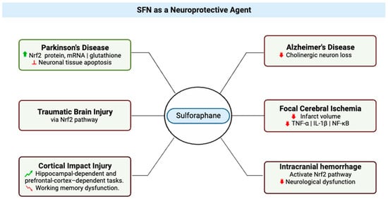 Multifaceted Neuroprotective Effects of Sulforaphane (SFN) in Diverse Neurological Conditions. The central node represents sulforaphane, while six distinct branches emanate from it, each depicting a specific condition where SFN exerts its therapeutic impact. Texts attached to each branch elaborate on the molecular mechanisms and outcomes associated with SFN’s effects in these conditions. Red signifies reduction or decrease in effects. Green indicates an increase or improvement in effects. This illustration was made with Biorender.com (accessed on 8 August 2023) [24,25,26,27,28,29,30,31].