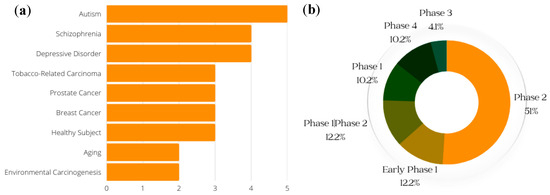 Conditions for which clinical trials with SFN have been registered. (Generated with data from ClinicalTrials.gov) (a) Conditions and respective numbers of clinical trials. The x-axis represents the number of studies that have recorded clinical trials with SFN and the conditions on the y-axis. (b) Breakdown of the phases of SFN clinical trials. This gives a general breakdown of how far SFN clinical trials have gone, with a majority of studies at the Phase 2 level.