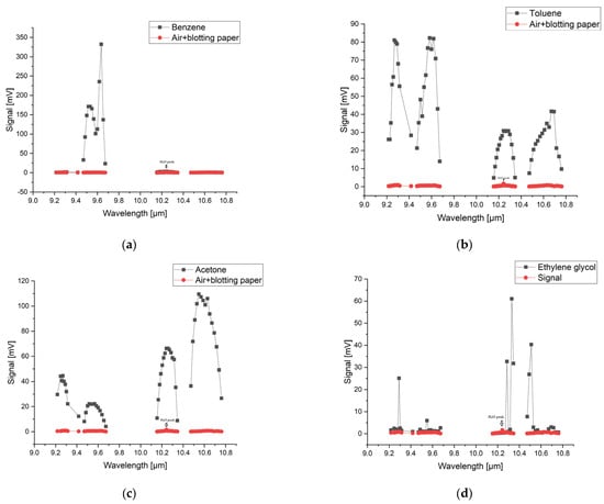 Figure 1 shows both the reference spectrum and the absorption spectra for benzene, toluene, acetone, and ethylene glycol based on the signal measurements in the 9.2–10.8 µm range in the gas form compared with the spectra of the ambient air and blotting paper at atmospheric pressure. The figure also shows the absorption peak of water from the ambient air. The water peak is also marked on the graphs.