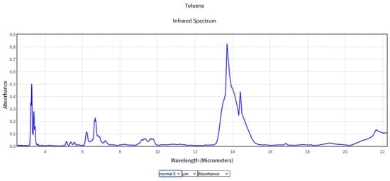 - Toluene. Available online: https://webbook.nist.gov/cgi/cbook.cgi?ID=C108883&Units=SI&Type=IR-SPEC&Index=0#IR-SPEC (accessed on 11 August 2023).