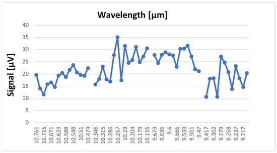 The reference signal shows in the 10R branch a small increase due to the presence of water vapor, but it is very small compared to the sample signals. The laser power inside the cell during spectral acquisition was between 0.5 W on the weaker lines and 3 W on the stronger lines. Each substance has its own chemical properties and has a characteristic IR spectral signature and its own absorption lines. The maximum absorption of benzene was observed in the 9P branch at the 9.636 µm wavelength of the CO2 laser, corresponding to the 9P(30) laser line. Toluene shows several absorption peaks, especially in the 9 µm range with four signal maxima at the wavelengths 9.583 µm, 9.618 µm, 9.258 µm, and 9.268 µm, corresponding to the lines 9P(24), 9P(28), 9R(22), and 9R(20).While benzene and toluene have a similar chemical structure and they absorb in the 9 µm region, acetone and ethylene glycol show absorption in the 10 µm region. For acetone, the 10P(28) and 10P(20) lines at 10.671 µm and 10.588 µm in the 10P branch are highlighted. Ethylene glycol presents a maximum signal value on the 10R(8) line at 10.330 µm and two smaller values on the 10R(6) lines at 10.346 µm and 10R(14) at 10.286 µm. By determining the absorption spectra of these substances, their maximum absorption was observed in the range 9.2–10.8 µm. Knowing these absorption lines, target compounds can be easily detected quantitatively.
