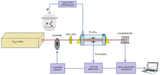 Identification of the explosive chemicals benzene, toluene, acetone, and ethylene glycol were performed using CO2LPAS. The entire spectroscopic system consists of a CO2 laser and a photoacoustic (PA) cell in which the gas is detected and analyzed in combination with a gas handling system [38,39,40].