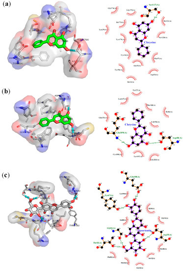 Two- and three-dimensional representations of the hydrogen bonding and hydrophobic interaction between ligands within the binding cavity of receptors. (a) Chrysin–2BL9 complex, (b) chrysin–4ZL4 complex, and (c) isoorientin–CET complex.
