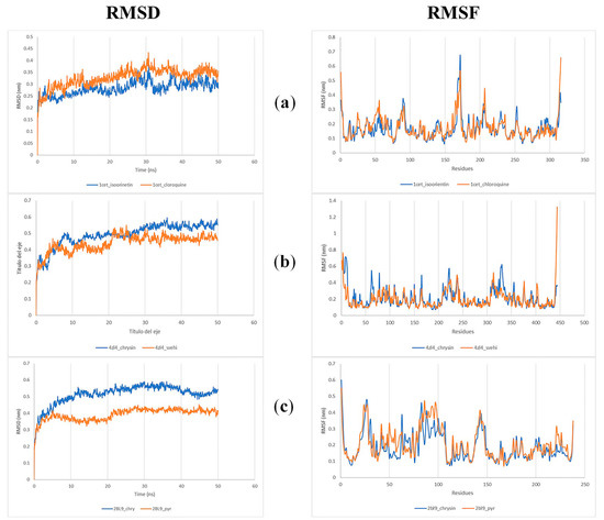 After evaluating the protein–ligand interactions and obtaining satisfactory results, molecular dynamics (MD) analysis was conducted on the ligands with the highest affinity energies to their targets to assess the stability of the protein–ligand complexes. MD simulations were performed for 50 ns for the complexes with the lowest affinity energy: chrysin–2BL9, chrysin–4ZL4, and isoorientin–1CET.