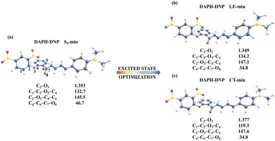 The optimized structures of DAPH-DNP in the S0 (a), LE (S1) (b), and CT (S2) states (c). The labeling of atomic color: O: red; C: blue; H: white; N: yellow, the bond length in Å, the dihedral angle in degrees.